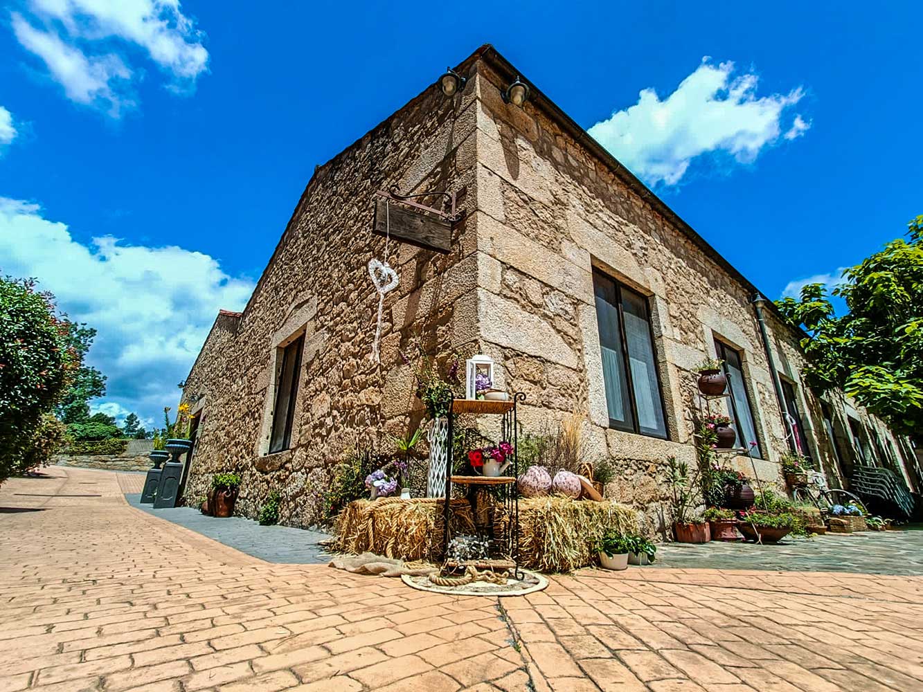 Imagen de la fachada del hotel rural A Velha Fábrica, en Valverde del Fresno (Sierra de Gata), decorada para una celebración de boda. Refleja el encanto y la elegancia de los eventos que organizamos en nuestras instalaciones.